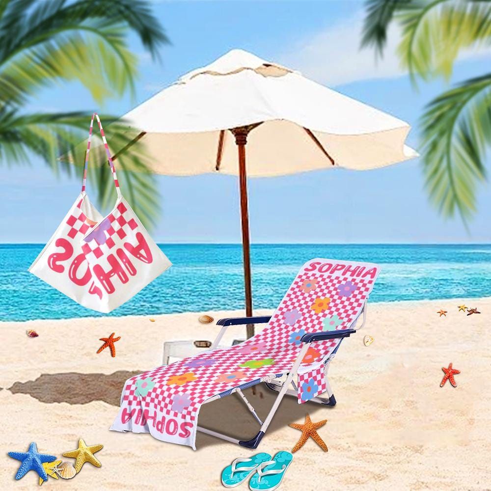 Customized Beach Towel Personalized Beach Chair Cover with Side Pockets, Thick and Quick Dry Custom Name Chaise Lounge Chair Towel Cover